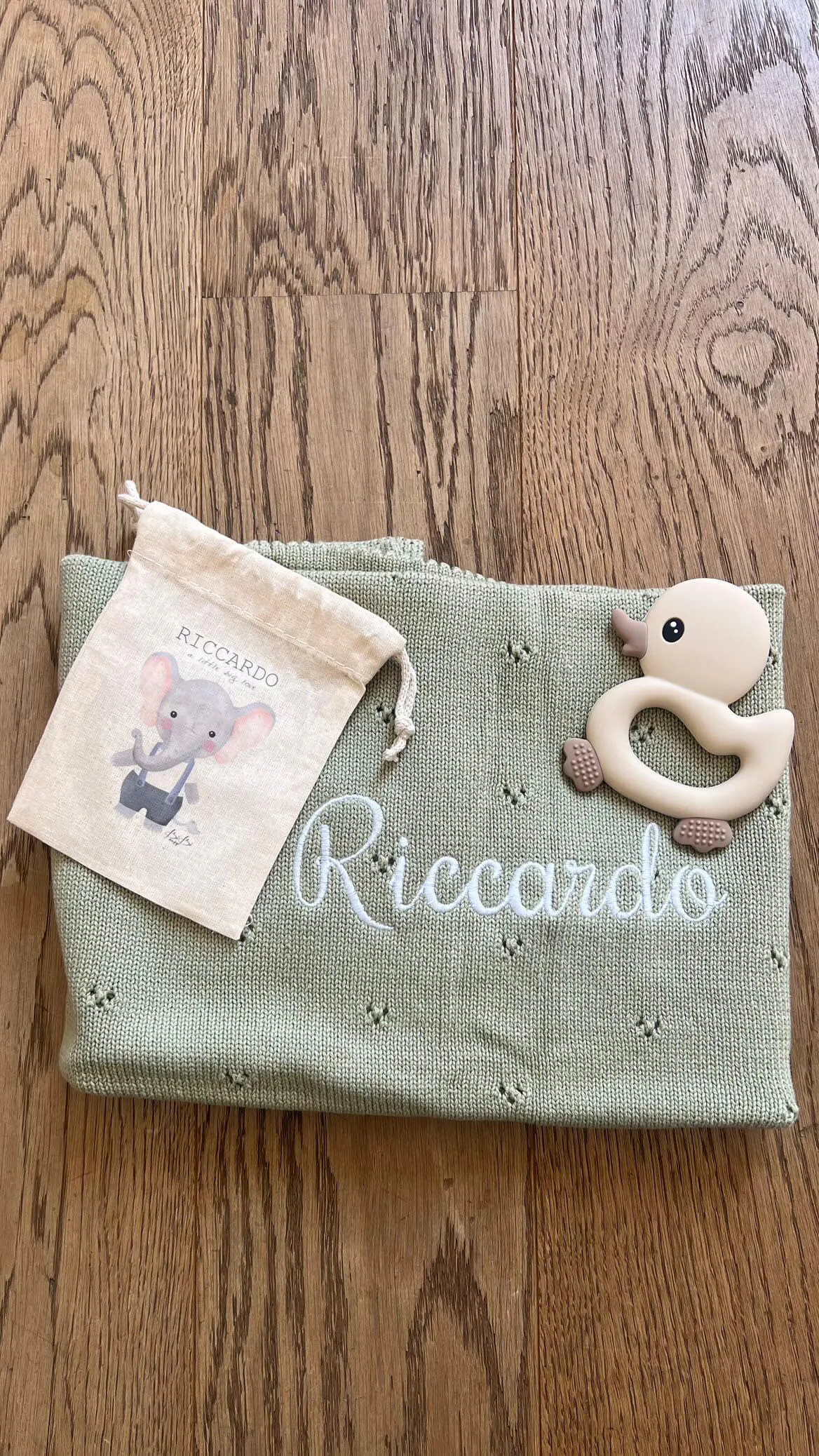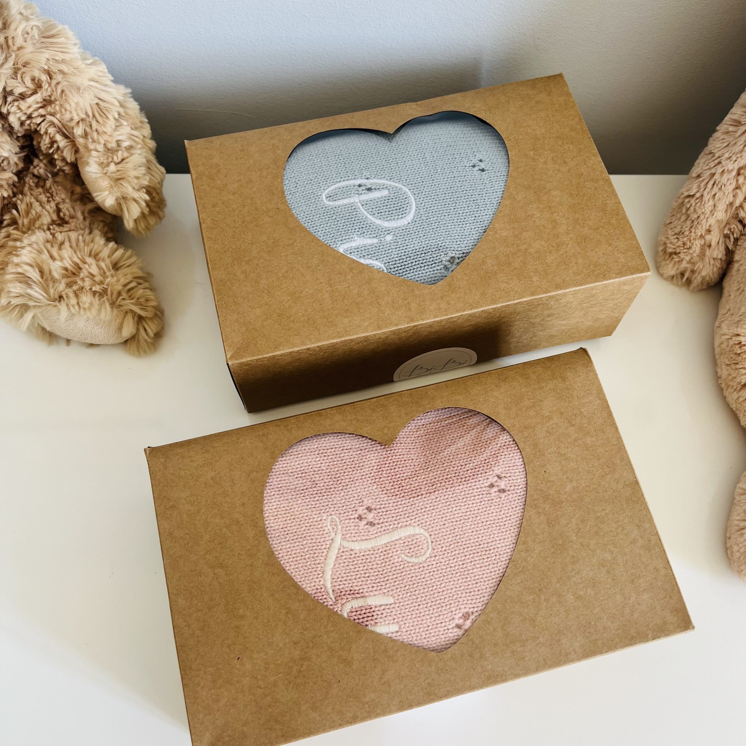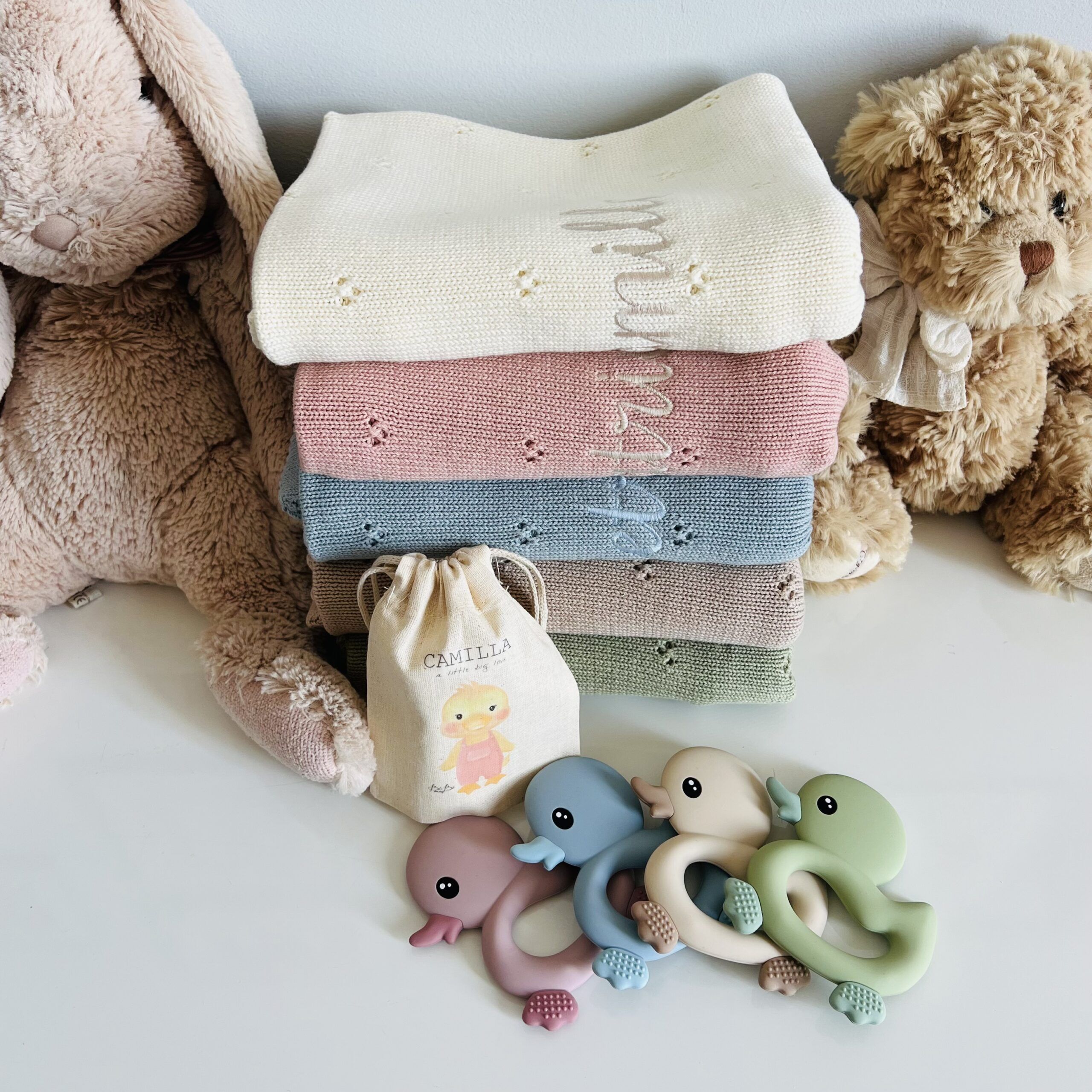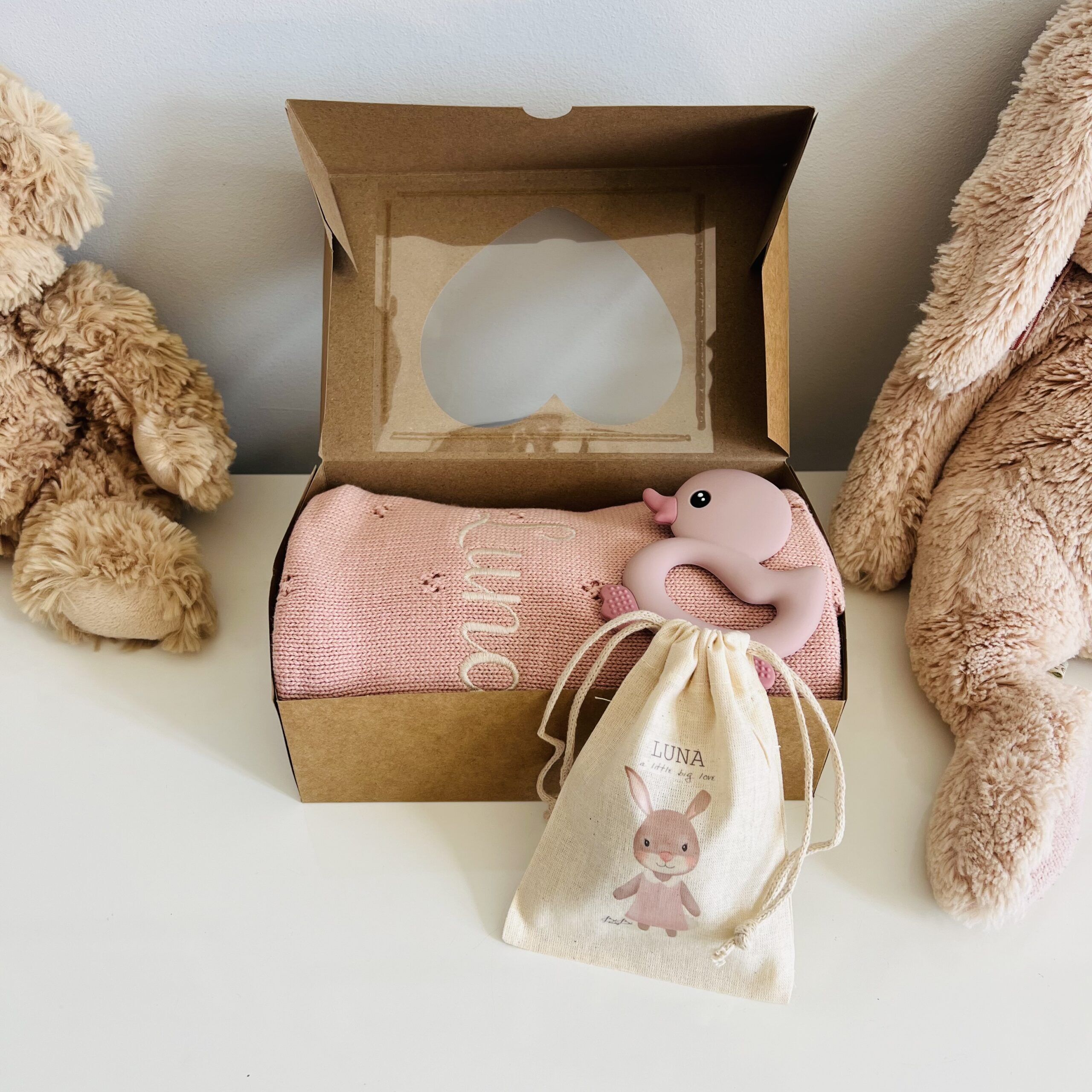 In questa confezione confezionata in una scatola con un cuore sopra trasparente troverai: Copertina in maglia 100% Cotone con motivo traforato 70×90 cm + un giocattolo da mordere in silicone a forma di Papera + un sacchetto personalizzato con il nome e l’animaletto