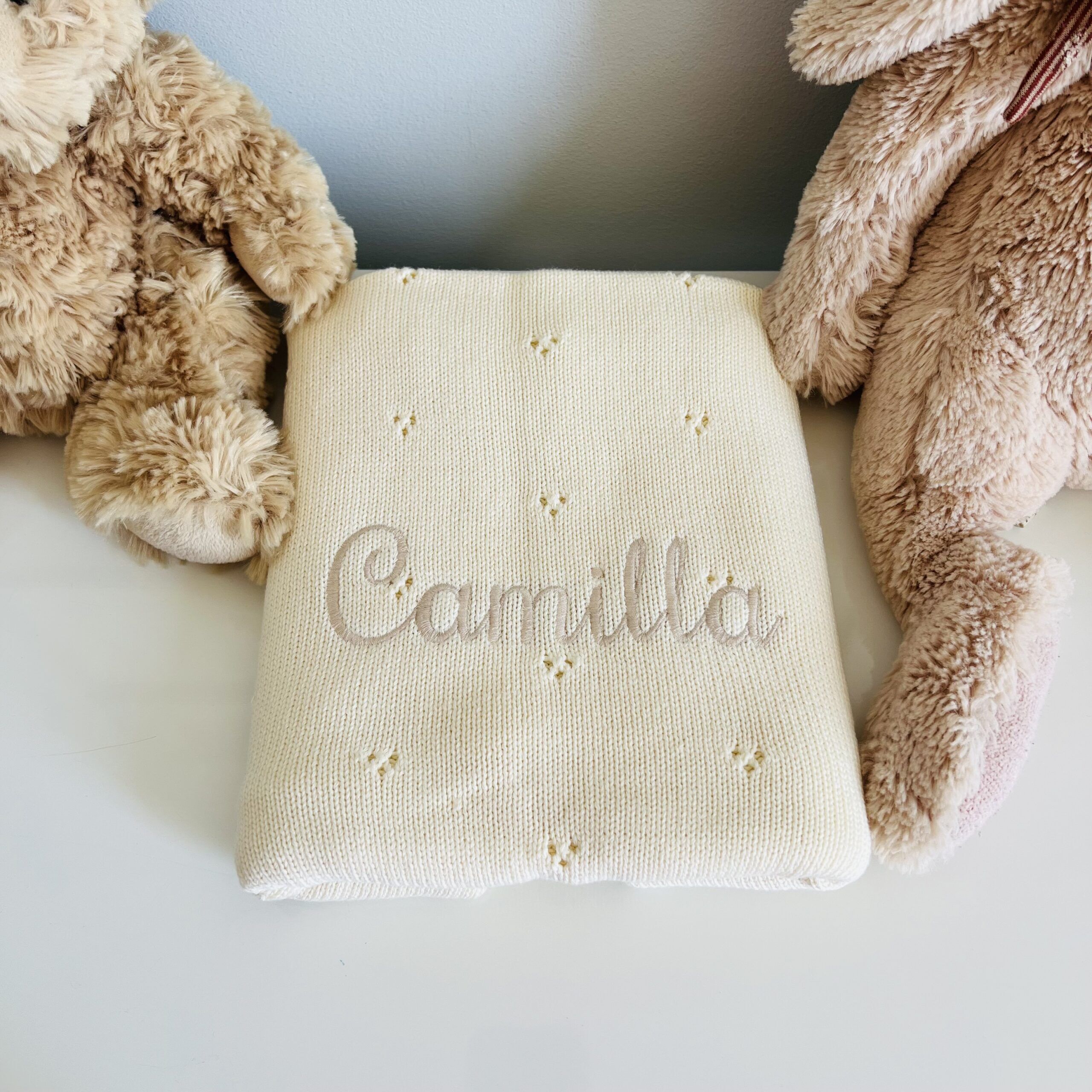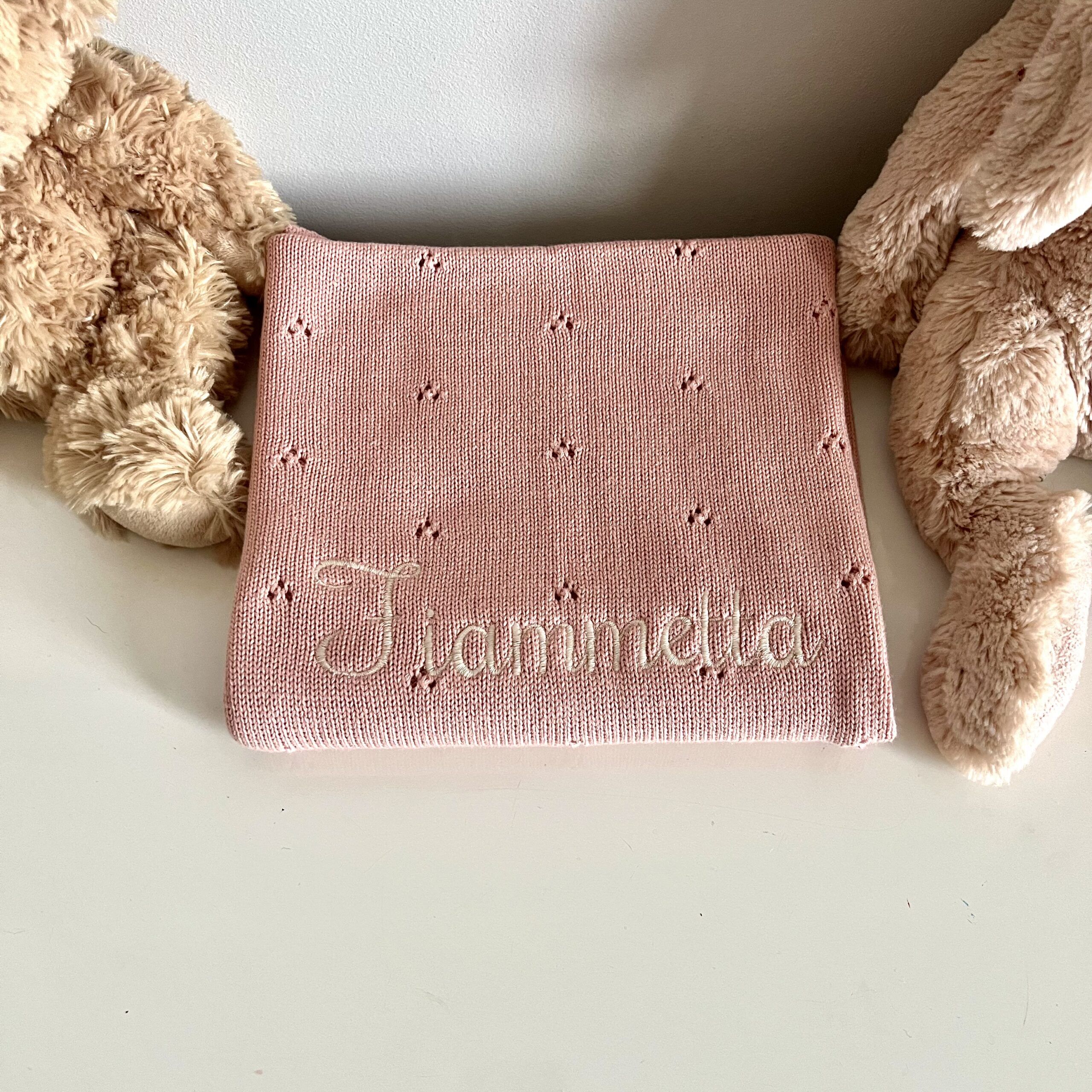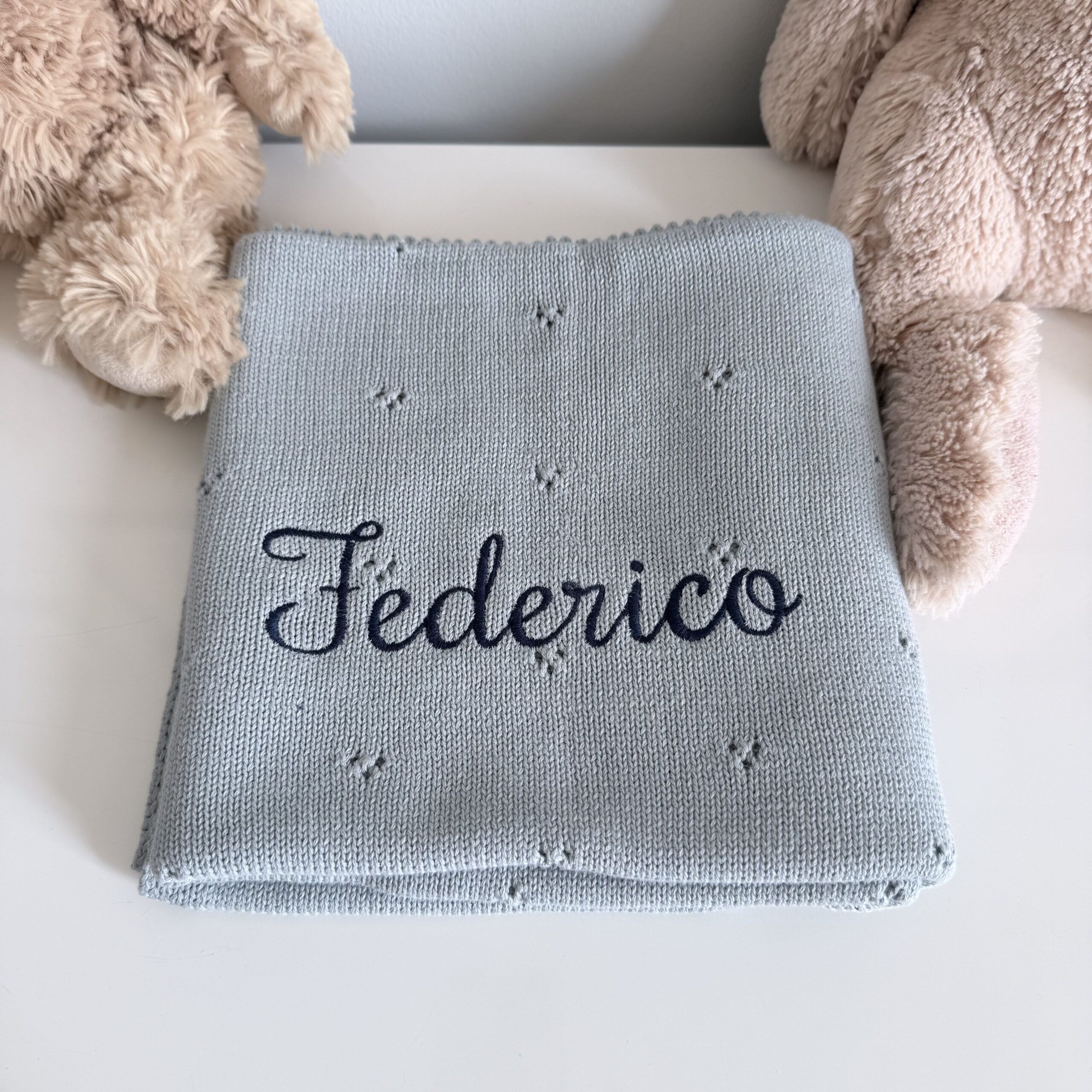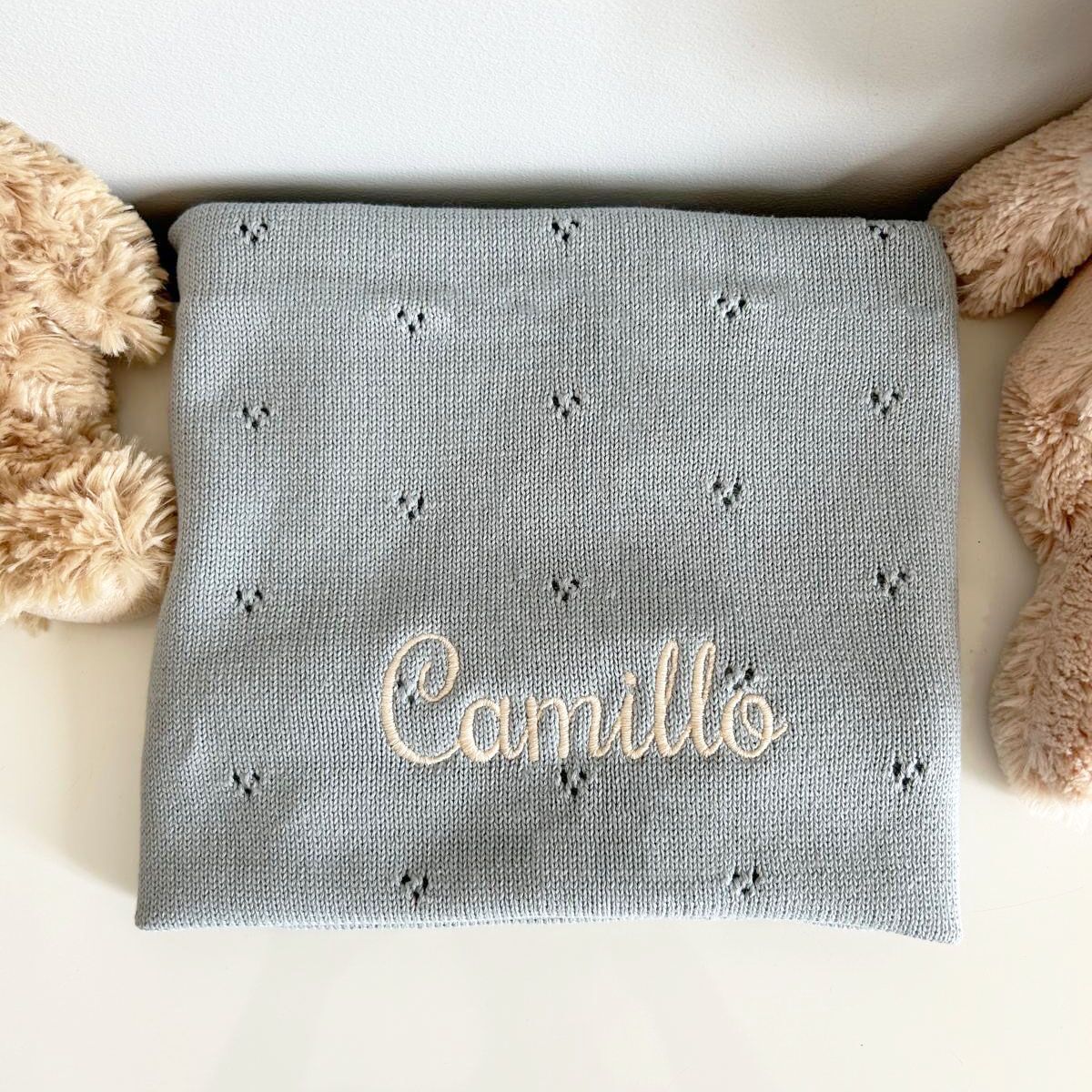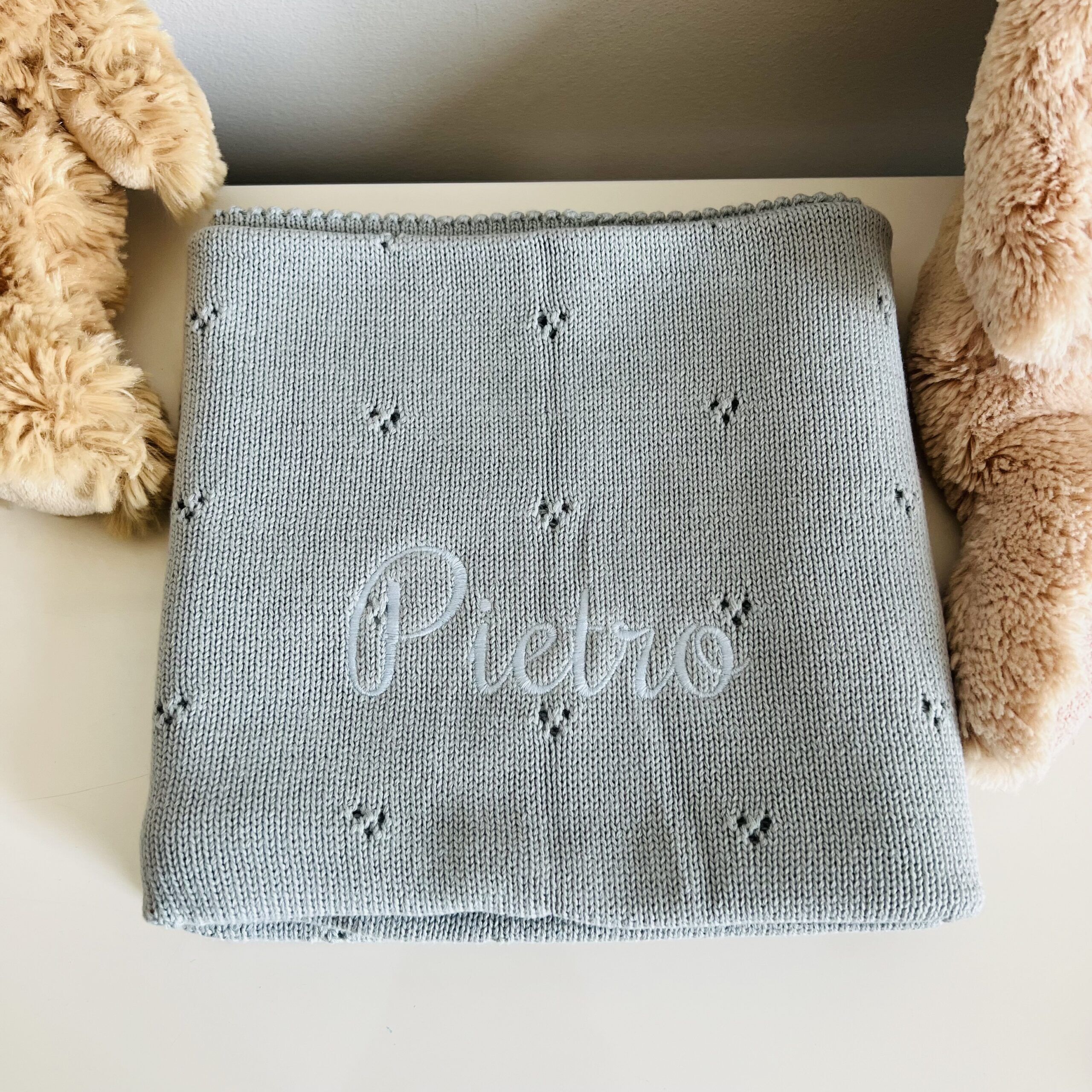 In questa confezione confezionata in una scatola con un cuore sopra trasparente troverai: Copertina in maglia 100% Cotone con motivo traforato 70×90 cm + un giocattolo da mordere in silicone a forma di Papera + un sacchetto personalizzato con il nome e l’animaletto