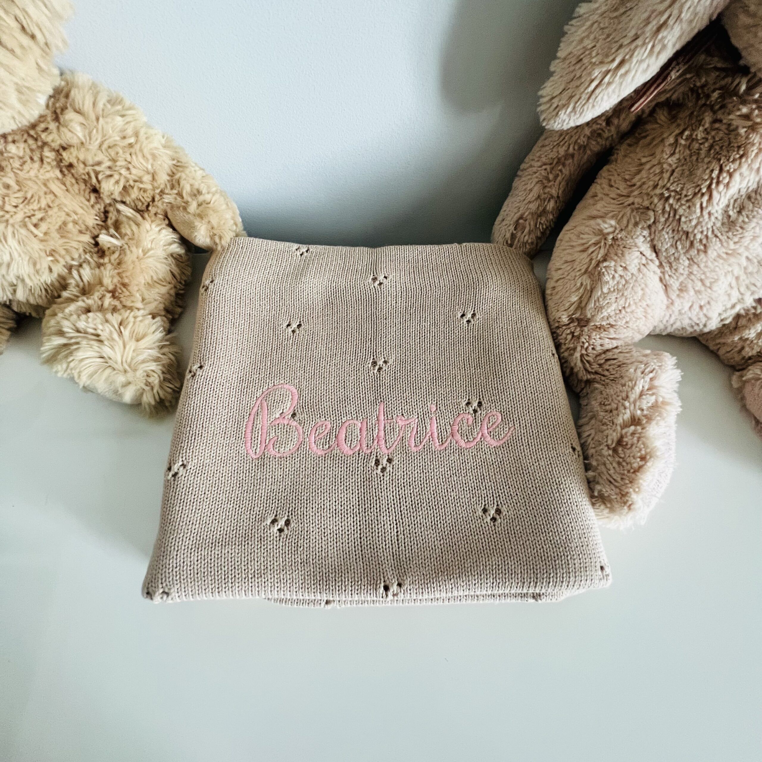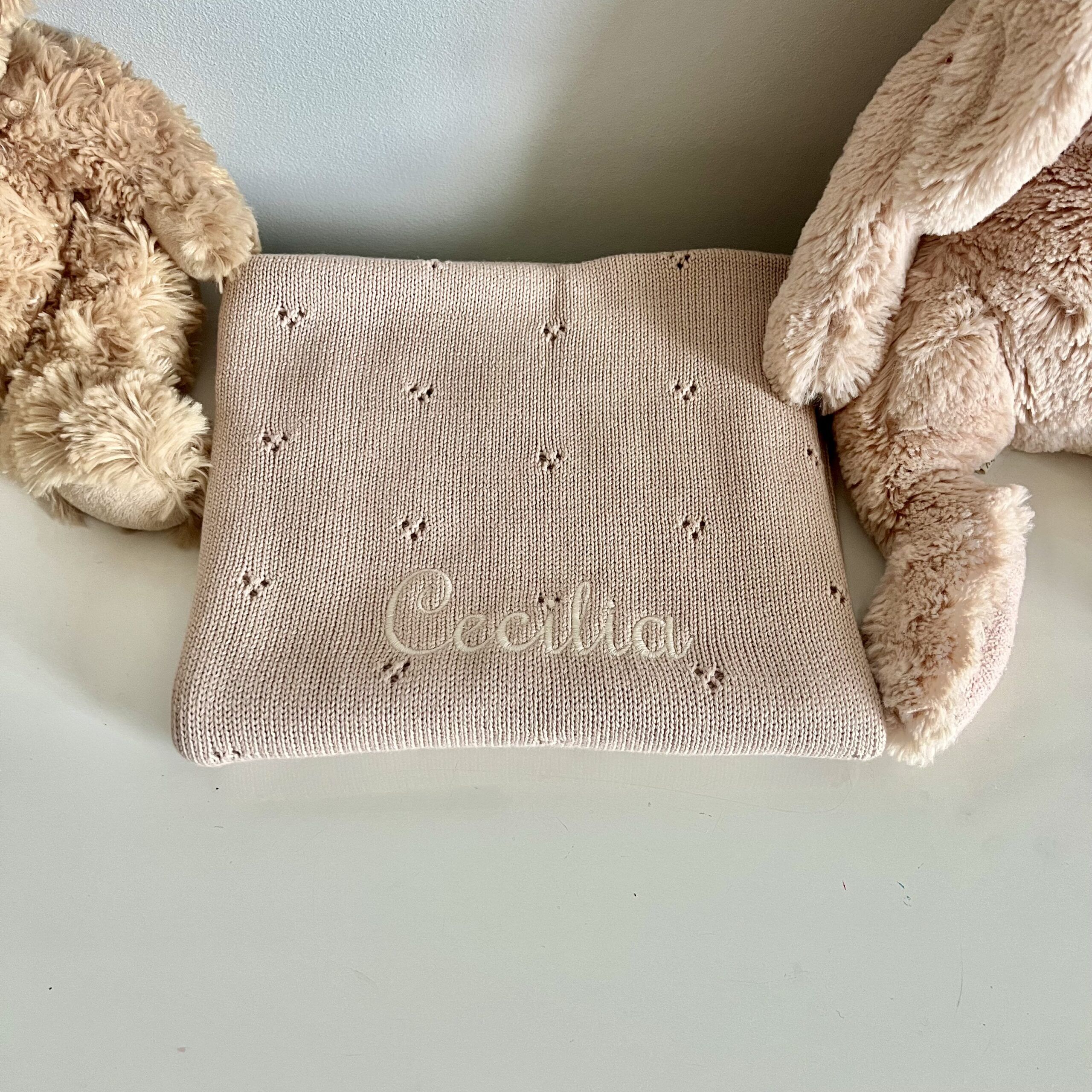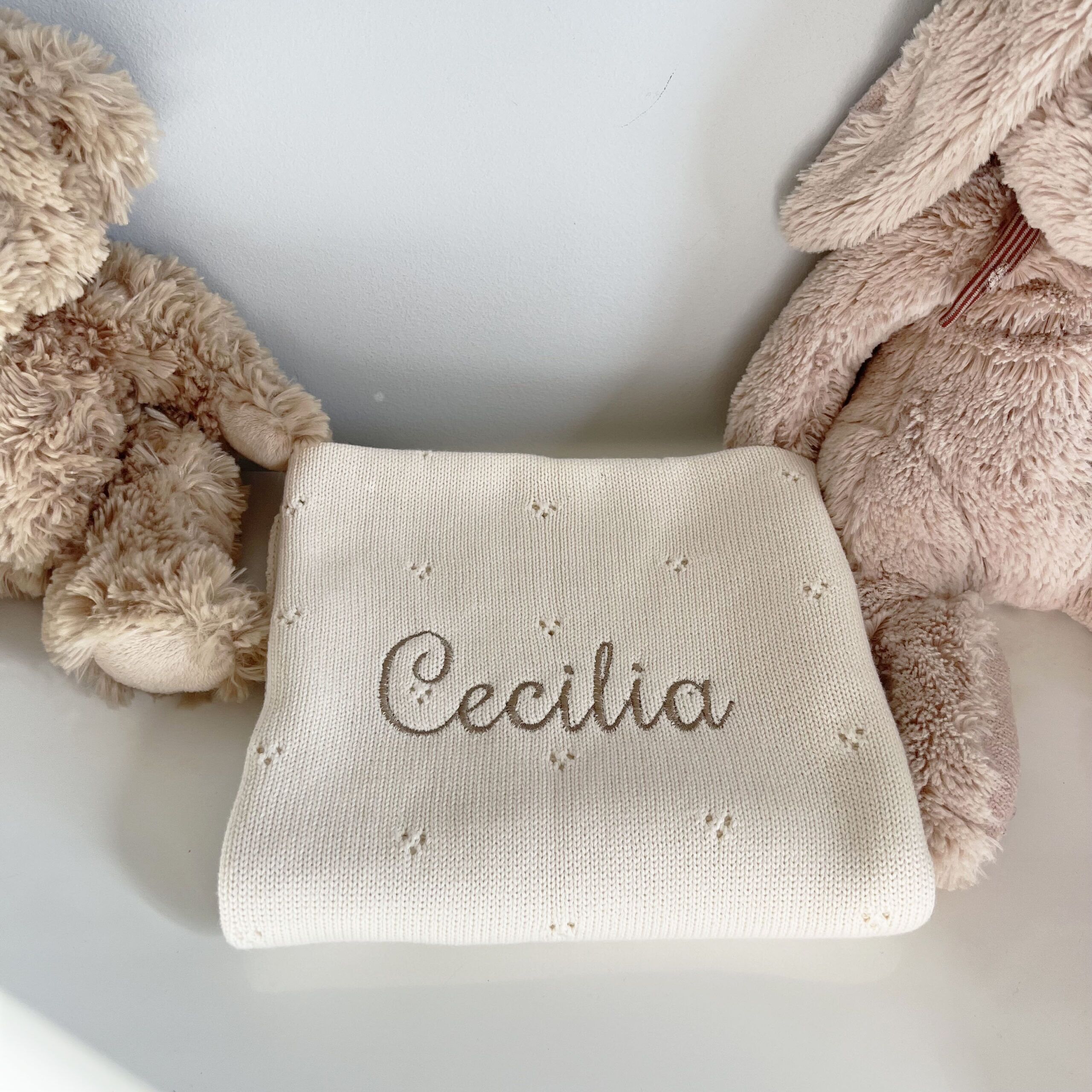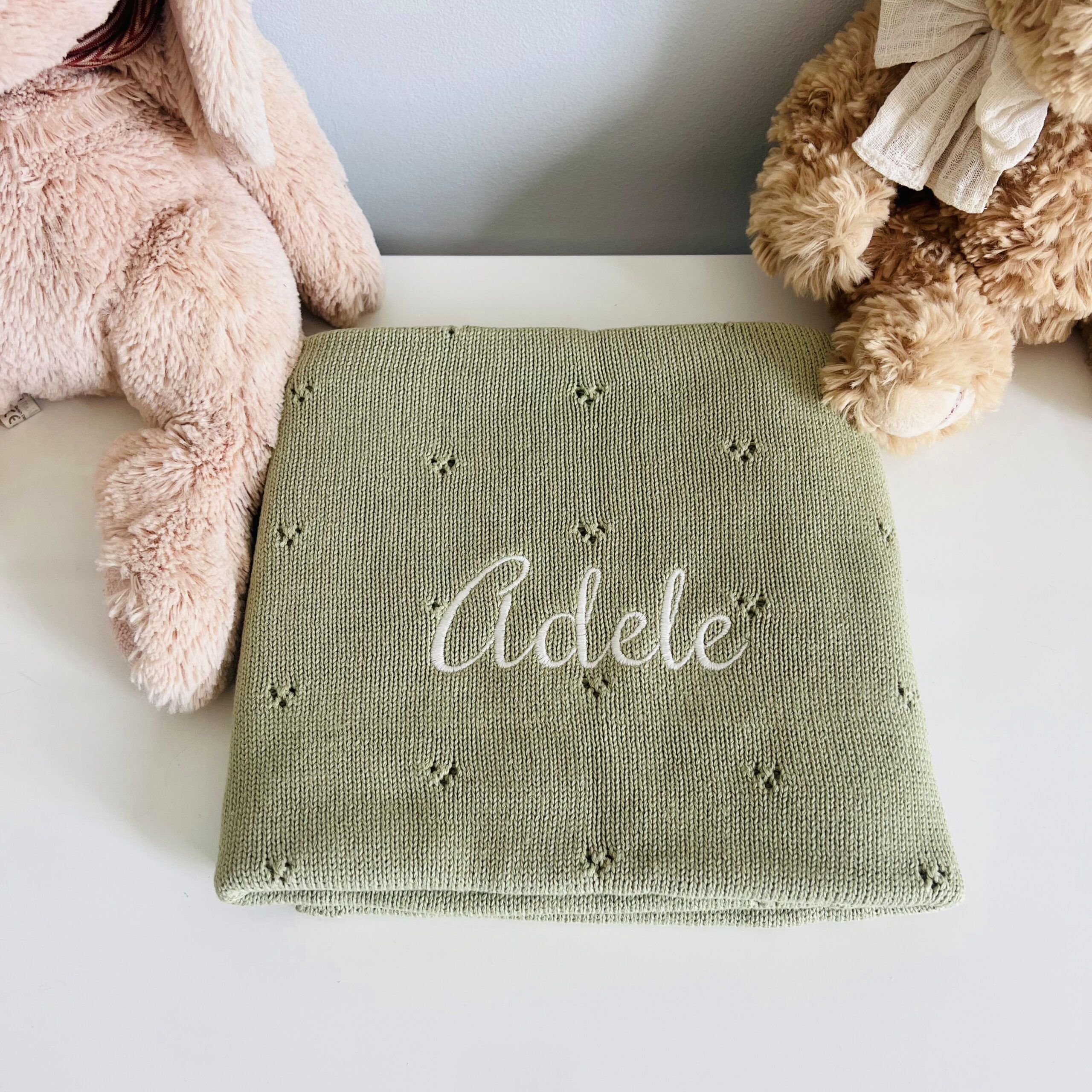 In questa confezione confezionata in una scatola con un cuore sopra trasparente troverai: Copertina in maglia 100% Cotone con motivo traforato 70×90 cm + un giocattolo da mordere in silicone a forma di Papera + un sacchetto personalizzato con il nome e l’animaletto