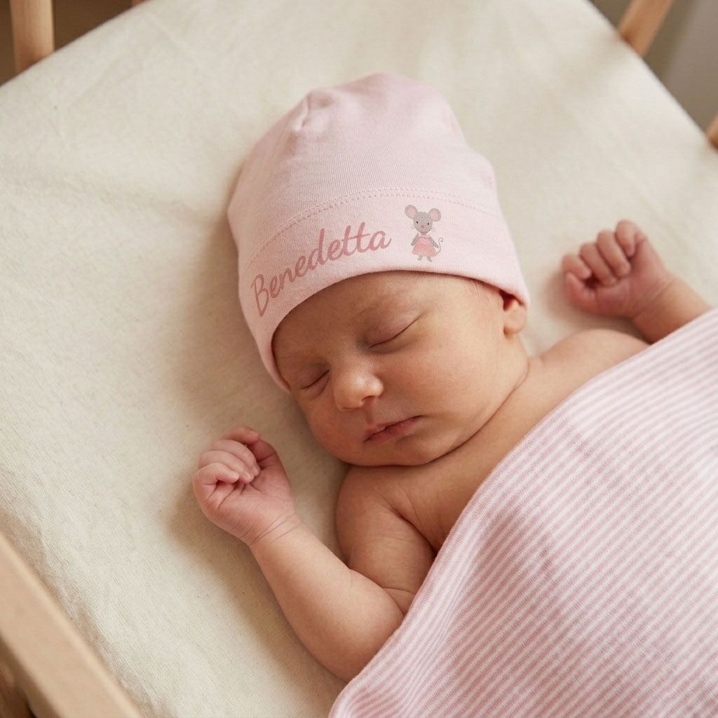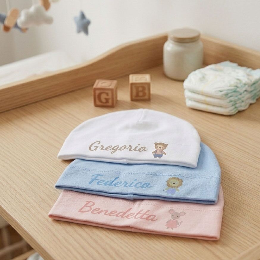 Cappellino da neonato in 100% cotone con ampio risvolto in taglia unica (0-12 mesi) personalizzato con il nome del bambino.
