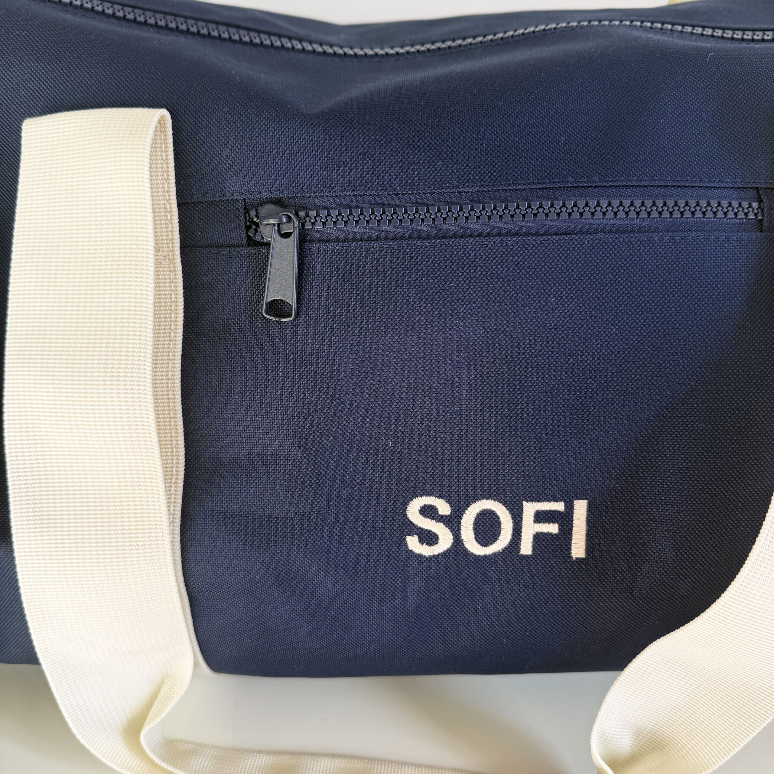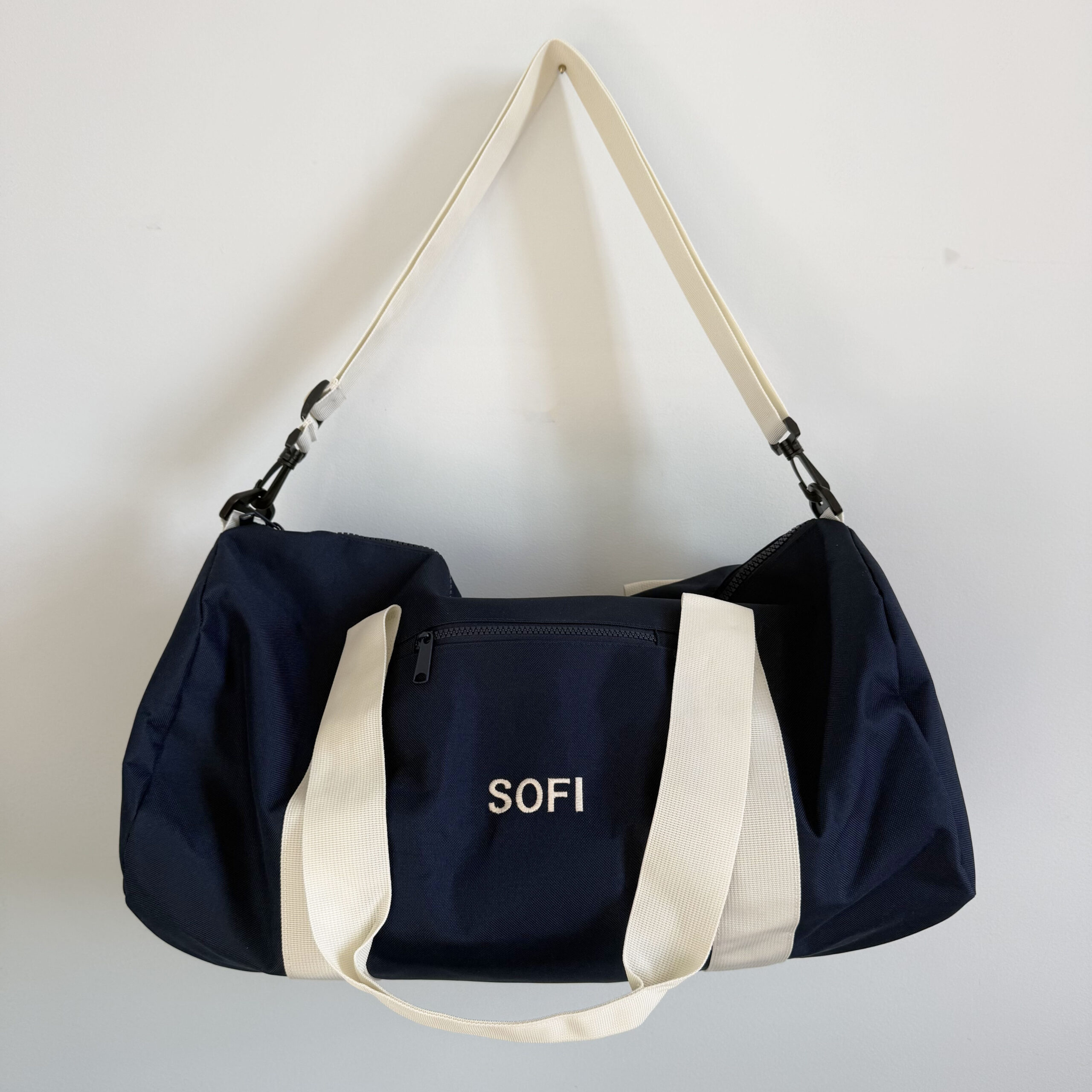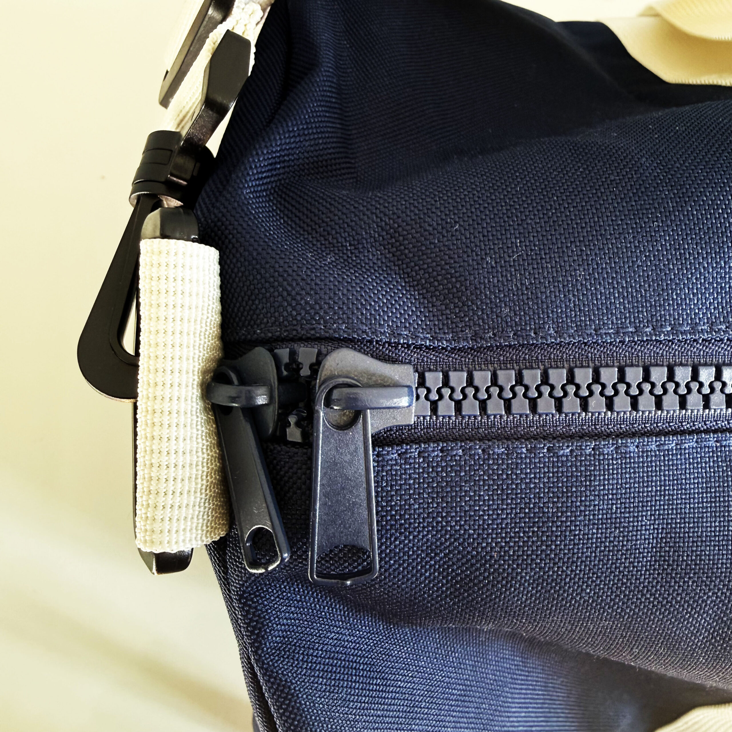 100% POLIESTERE SACCA CON DOPPIA CERNIERA con MANIGLIE color PANNA – TRACOLLA REGOLABILE STACCABILE – TASCA ESTERNA CON ZIP
